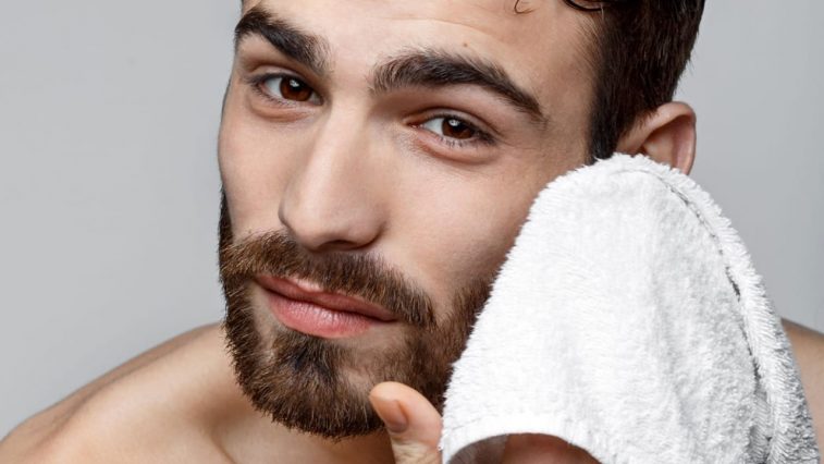 - Rửa mặt bằng nước lạnh và lau nhẹ nhàng bằng khăn khô. Thoa một lớp dầu dưỡng sau khi cạo râu để bù nước, giảm kích ứng.