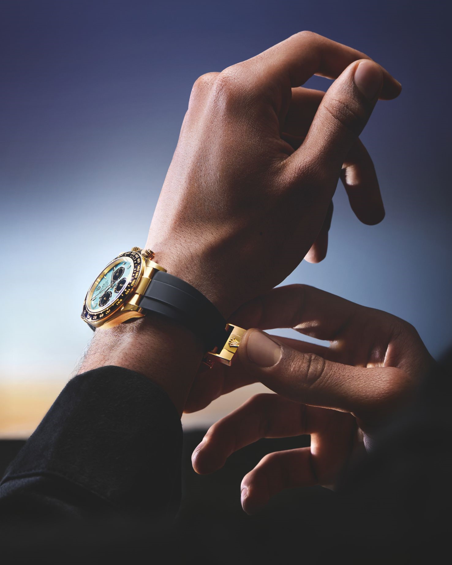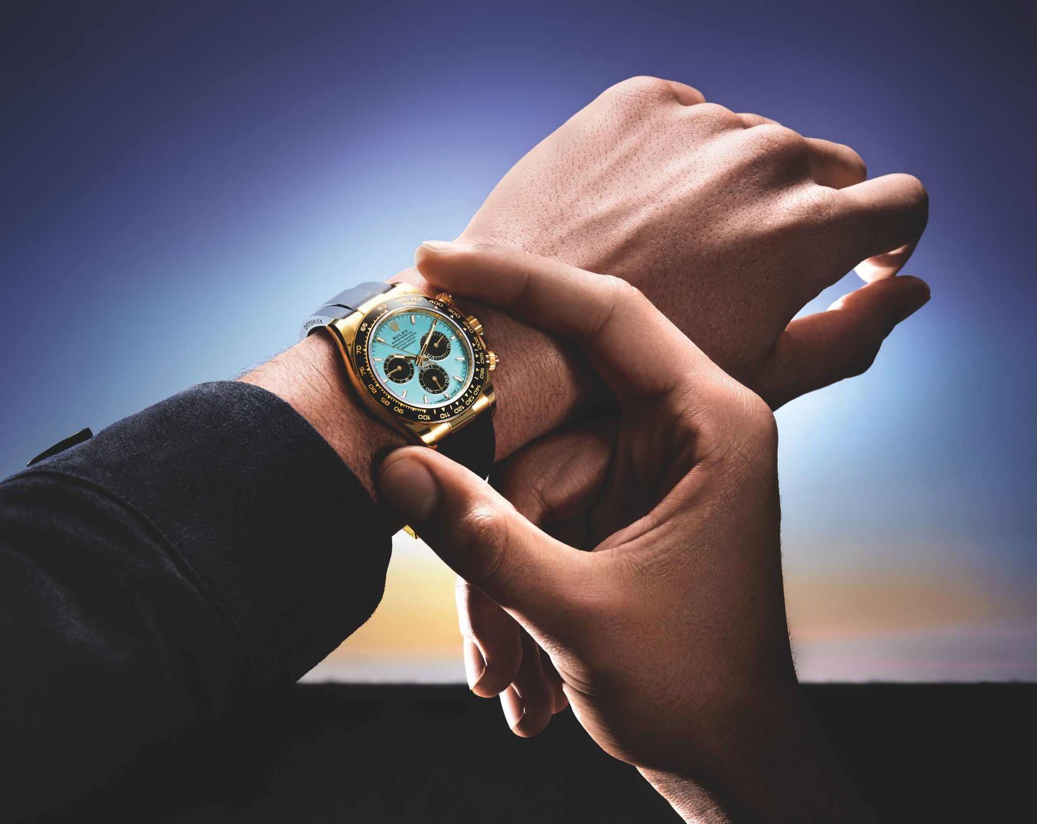 Gắn liền với khả năng đo thời gian chính xác, đồng hồ Oyster Perpetual Cosmograph Daytona sở hữu mặt số sơn mài màu xanh ngọc lam ấn tượng, nổi bật với các bộ đếm màu đen bóng chạm vân tròn đồng tâm, cùng vạch chỉ giờ và bộ kim bằng vàng kim 18 ct phủ Chromalight – chất liệu dạ quang độc quyền của Rolex, cho khả năng phát sáng rõ nét và dễ đọc trong mọi điều kiện ánh sáng.