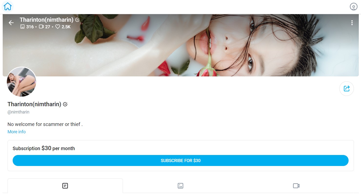 Vốn là một người mẫu Playboy, cô gái Thái Lan này thường xuất hiện trên trang cá nhân với một hình ảnh cực kì quyến rũ và xinh đẹp. Hiện nay, kênh OnlyFans của Tharinton đang sở hữu gần 3.000 lượt thích với mức phí đăng kí hàng tháng lên đến 30 USD.