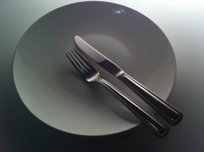 Nếu bạn vẫn còn ăn hãy đặt dao và nĩa chéo nhau theo hướng 4h và 8h. Nếu đã ăn xong hãy hãy đặt dao và nĩa cùng hướng 4h hoặc hướng 8h để nhân viên có thể dọn đi.