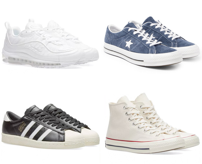 Nếu bạn không muốn bận tâm quá nhiều về cách phối quần áo, hãy chọn cho mình những đôi giày trắng, có thiết kế cơ bản, đơn giản như Stan Smith, Common Project, Converse Chuck Taylor,…Để tránh sự nhàm chán của màu trắng đơn điệu bạn có thể chọn những tone màu tối hay xanh navy, màu quân đội,..