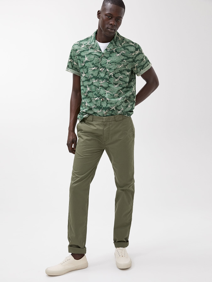 Nhắc đến mùa Hè, có lẽ áo sơ mi cổ cuban là nhân vật không thể nào thiếu. Đây cũng là mẫu áo rất phù hợp để sơ vin và đáng được đầu tư cho tiết trời oi bức này. Đối với mẫu áo này, bạn nên chọn áo có họa tiết nổi bật và phối layer với một chiếc áo thun cổ tròn bên trong. Sau đó, diện cùng với một chiếc quần chinos và giày thể thao trainers màu trắng để trang phục thêm phần lịch sự.
