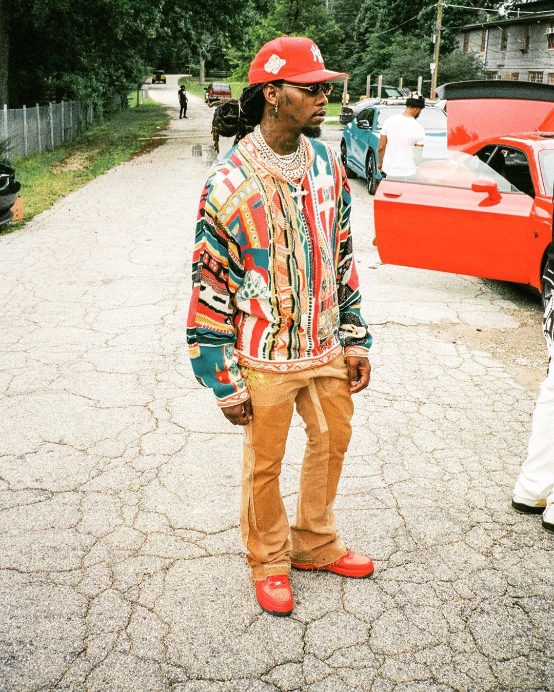Offset sở hữu một trong những bộ trang phục màu sắc nhất tuần này, xứng đáng là statement outfit mùa Hè. Anh mặc cho mình chiếc áo đan cáp sắc màu với rất nhiều họa tiết đan xen đậm phong cách tribal của châu Phi, trên cổ là những chiếc vòng vàng thường thấy ở các rapper. Chiếc quần đế thấp màu nâu nhạt cùng đôi giày đỏ càng làm cho chiếc áo knitwear thêm phần chói lọi. Và mái tóc afro cũng là một yếu tố góp phần tạo nên âm hưởng da màu cho outfit của anh.