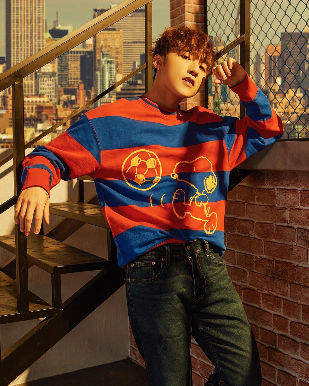 Trong bản phối thứ 2, Sơn Tùng M-TP đề cao sự thoải mái, năng động với áo sweatshirt mang hoạ tiết kẻ ngang màu xanh – đỏ được nhấn nhá với nhân vật hoạt hình kinh điển – chó Snoopy. Phối cùng áo, anh lựa chọn quần indigo denim cùng đôi sneakers Off-white Worn-Look Court Classic của Saint Laurent.