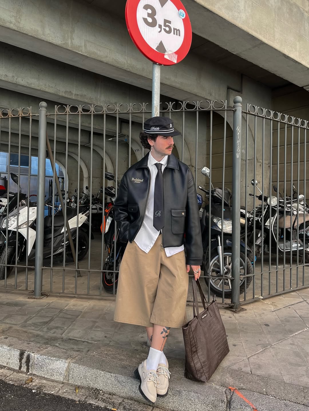 Bạn hãy ưu tiên bảng màu trung tính cho combo này. Quần short đen, be hoặc xanh navy kết hợp cùng sơ mi trắng. Áo khoác da màu đen hoặc nâu chocolate luôn là lựa chọn an toàn và hiệu quả. Nếu thời tiết nóng, bạn có thể chọn leather jacket dáng mỏng hoặc chất liệu giả da nhẹ để giữ sự thoải mái. Để tăng thêm tính thời trang, hãy thêm một chiếc cà vạt và mũ cùng tông màu với áo khoác da.