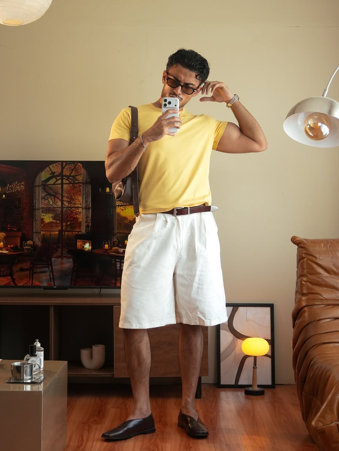 Để mặc đẹp, bạn hãy ưu tiên quần short dáng rộng vừa phải, chất liệu denim mềm, cotton. Áo thun nên chọn phom boxy, chất vải dày vừa đủ để giữ form. Hoàn thiện outfit bằng sneaker low-top, sandal da hoặc mule tối giản.