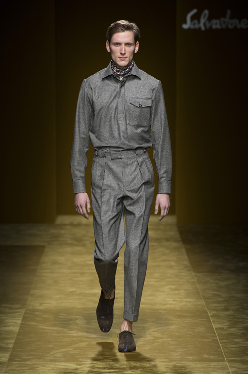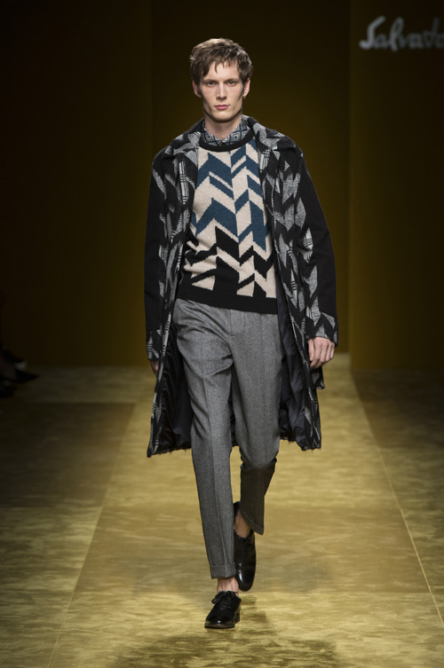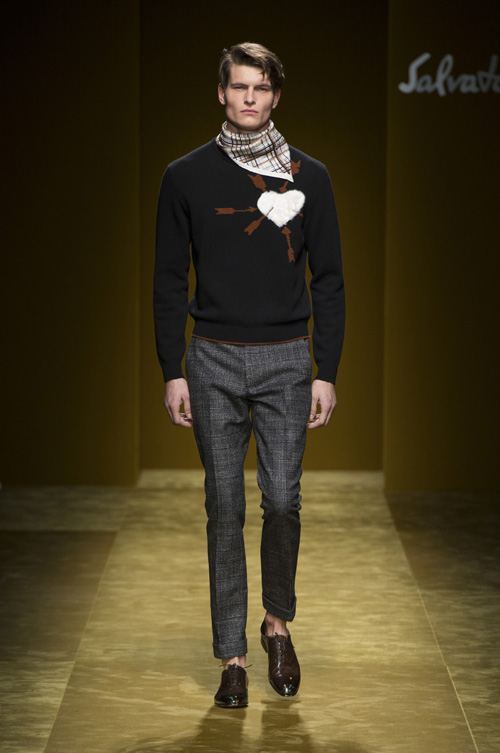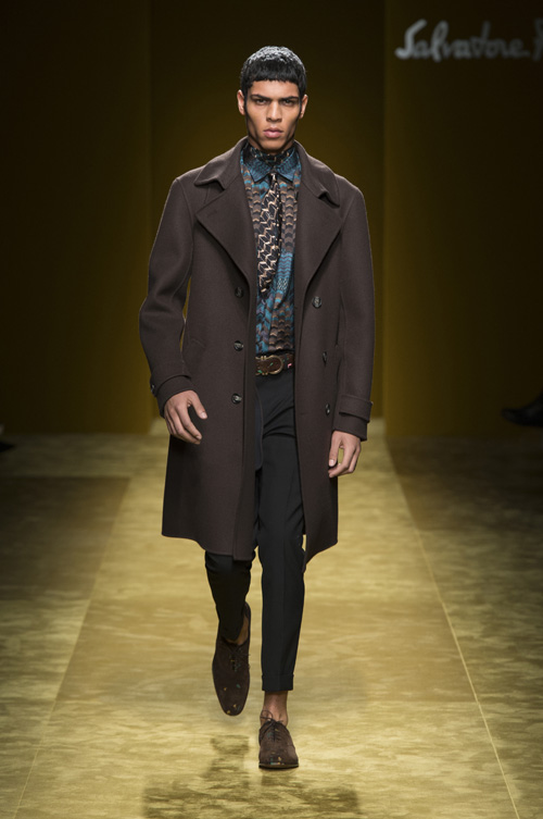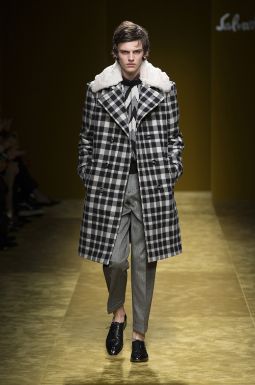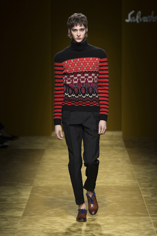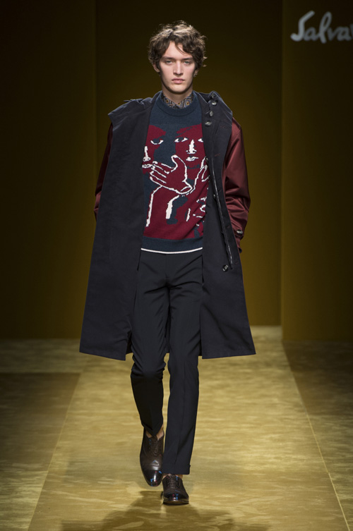 BST Salvatore Ferragamo Thu Đông 2016-17 được tạo nên nhờ những sắc thái đa dạng về màu sắc, họa tiết, bố cục và kiểu dáng trang phục. Bức thông điệp mà Giám đốc Sáng tạo Massimiliano Giornetti muốn truyền tải thể hiện ý niệm về sự xung khắc trong lối dư duy mới và cũ làm nên những quý ông đương đại.