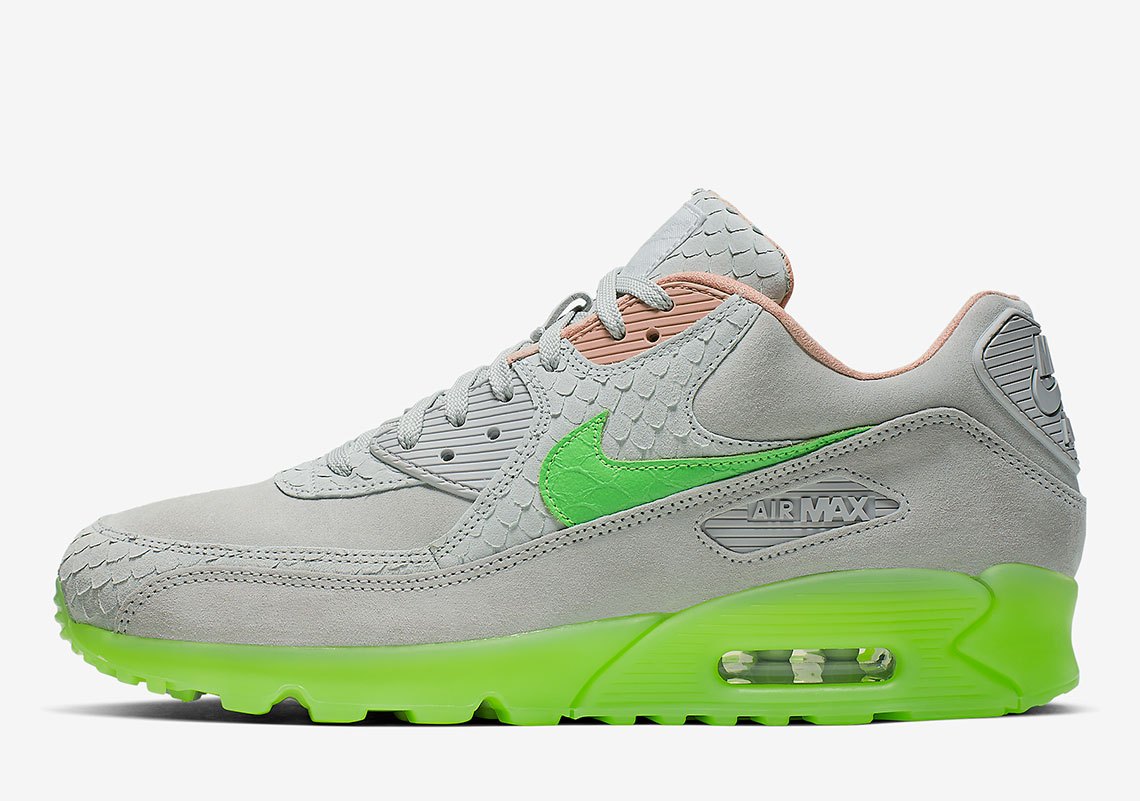 Trong tháng 9 này, Nike đã tạo ra một phiên bản cao cấp hoàn toàn mới cho hình bóng Air Max 90 với thiết kế mới lạ. Phiên bản giày thể thao sử hữu 3 màu: xám, xanh và be. Nike Air Max 90 là sự pha trộn giữa da lộn và nubuck với họa tiết có vảy, mang đến sự sang trọng cho thiết kế. Chi tiết có vảy xám trên upper mang đến thiết kế lạ mắt, sinh động cho hình bóng Nike Air Max 90. Màu sắc Electric Green làm nổi bật đôi sneakers, các chi tiết của hình bóng cũ dấu Swoosh và đế ngoài mờ vẫn được giữ lại.