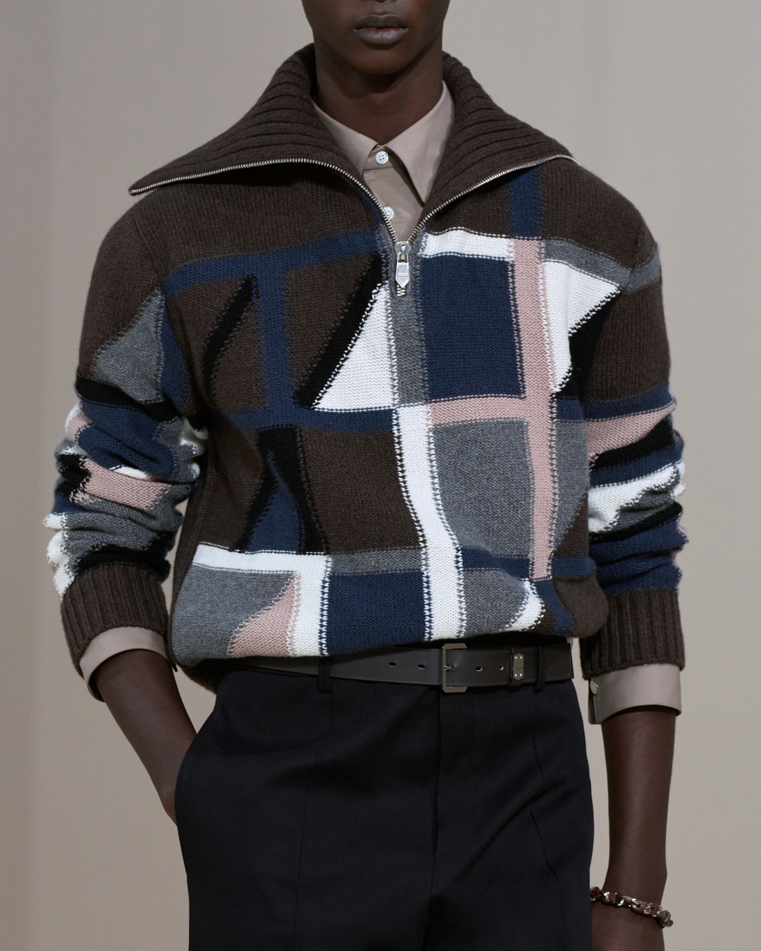 Áo len cổ lọ ấm áp với khóa kéo tinh tế, kết hợp hoàn hảo cùng áo khoác phối cổ lông cừu. Cảm giác dễ chịu, thoải mái đến từ chất liệu cao cấp, tinh tế, khiến lối mặc layer của Hermès luôn tạo cảm giác gọn gàng và tôn trọng hình thể người mặc thay vì bị giấu dáng. Chính bản thân nhà thiết kế Véronique Nichanian cũng xác nhận bản thân hạn chế tối đa tạo ra các chi tiết thừa hay đệm, lót cho trang phục, khiến tủ đồ Thu – Đông vẫn giữ cảm giác gọn nhẹ tới tinh giản.