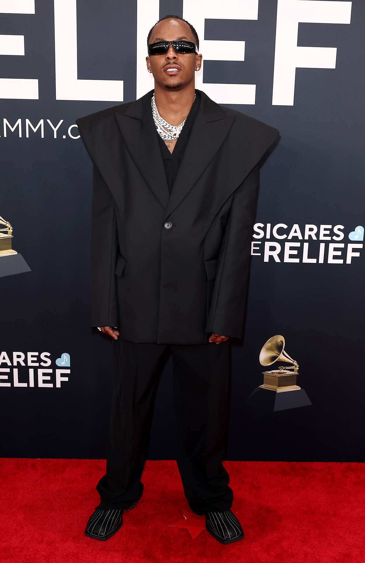Rich The Kid đến thảm đỏ Grammy trong một bộ suit oversized táo bạo của Annakiki. Nam rapper hoàn thiện outfit của mình với vòng cổ to bản đầy hầm hố, cùng chiếc kính đen thời thượng.