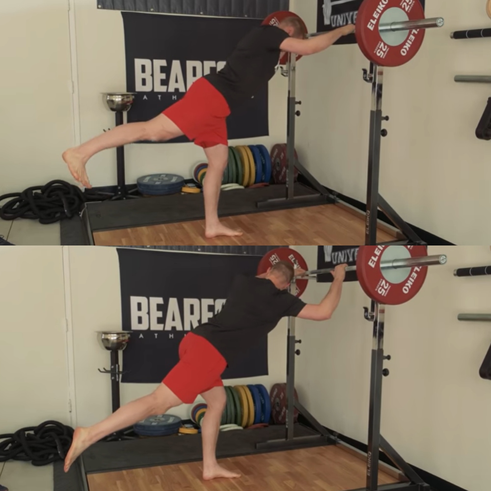Chúng ta sẽ có bài tập Assisted hip airplane để hỗ trợ phần cơ này. Đầu tiên bạn sẽ nắm 2 tay vào thanh treo ngang cùng với một chân đứng trụ và một chân nâng cao ra phía sau. Tiếp đó, nghiêng người rồi đẩy phần xương chậu của chân đang nâng xuống thấp dưới sàn và giữ trong 5 giây. Thực hiện cho cả 2 bên.