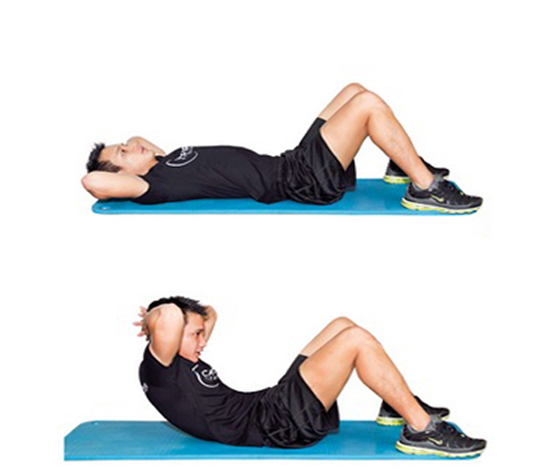 – Động tác 1: Đầu tiên bạn trong tư thế nằm ngửa trên một tấm thảm (nên sử dụng thảm tập Yoga để tránh trơn trượt), hai đầu gối co lại, hai tay để sau gáy, đùi tạo với mặt sàn một góc 45 độ như hình ảnh.