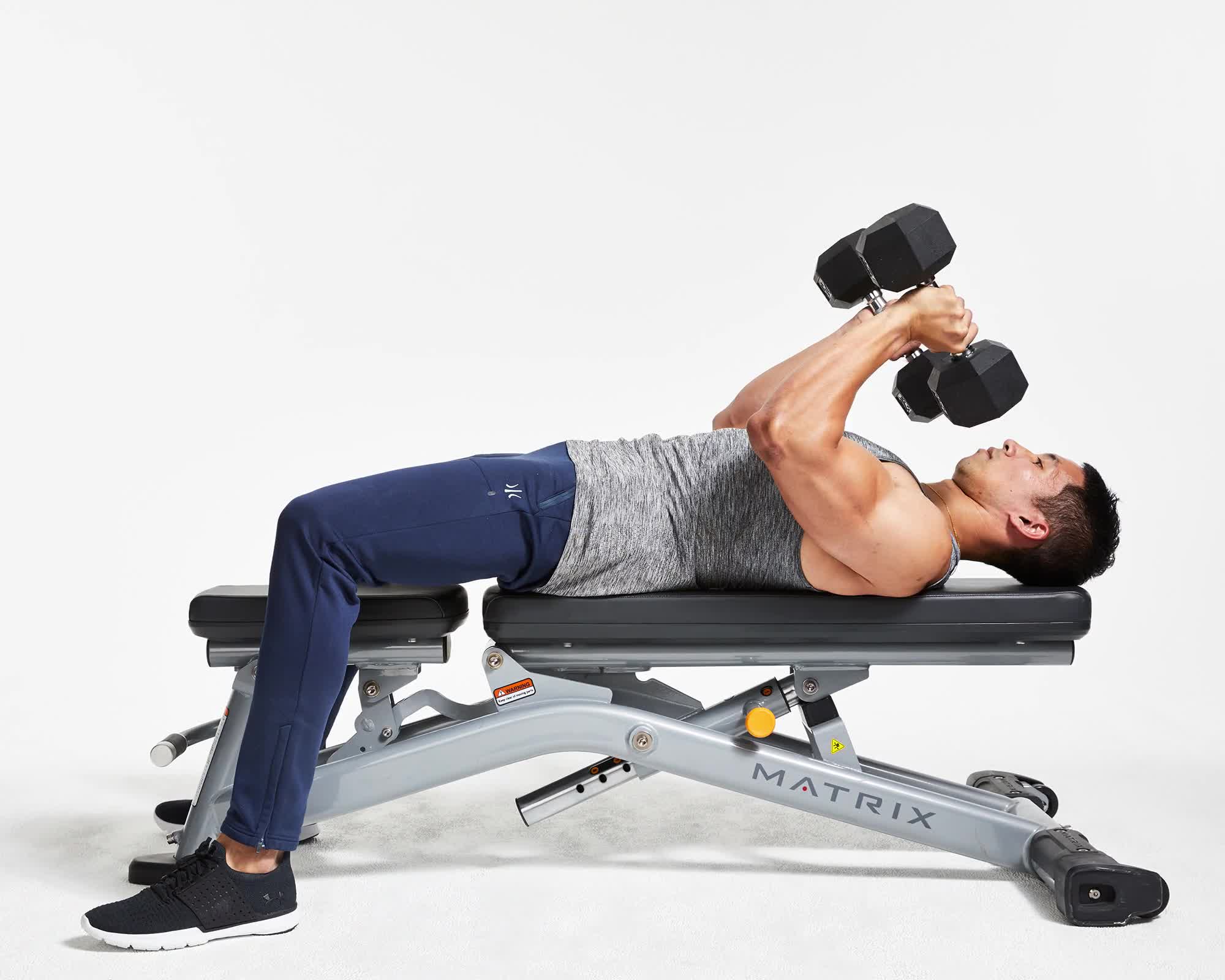 – Nằm ngửa trên băng ghế nghiêng 45 độ, siết chặt cơ bụng và cơ mông. Bả vai ghì chặt trên băng ghế