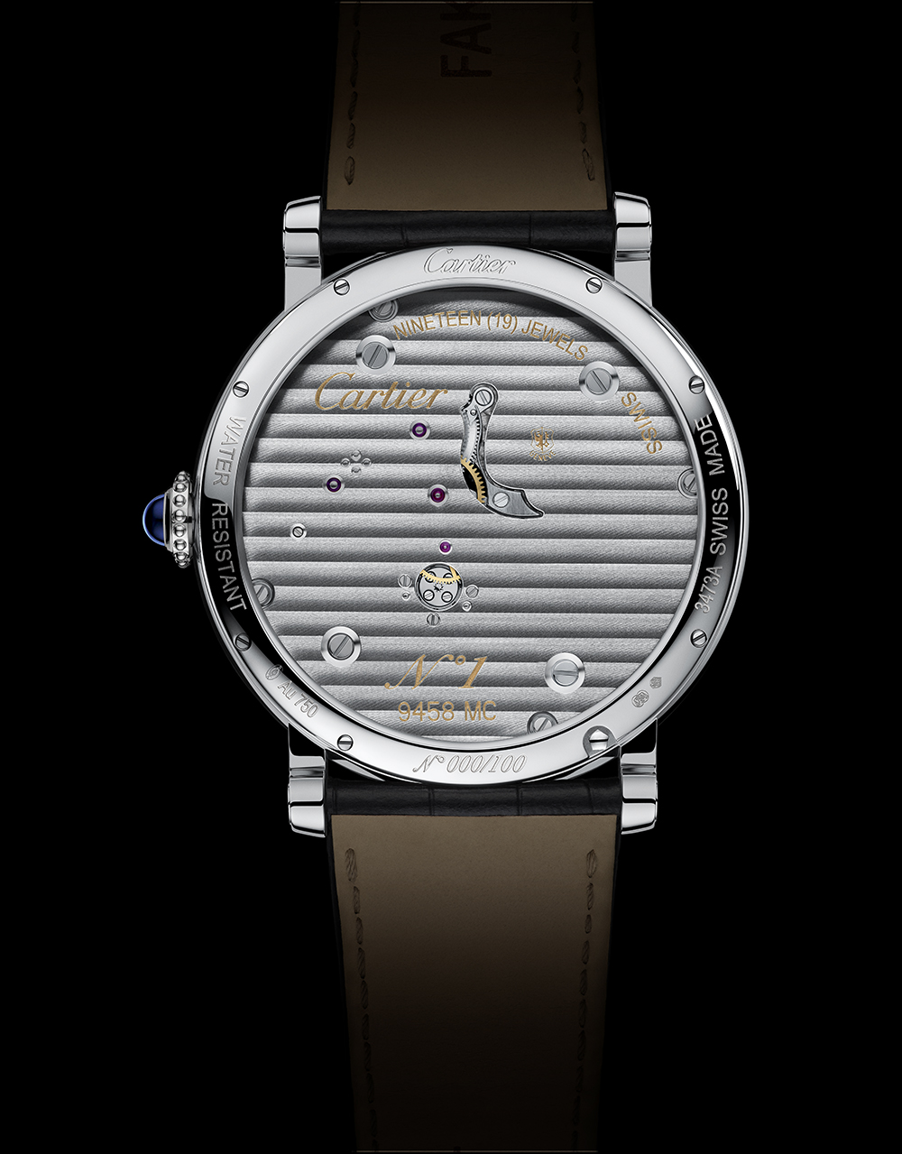 Khác với lối bố trí trên những mẫu đồng hồ Cartier nam thông thường, cách bố trí kim giờ và phút lệch bên thể hiện tư duy tự do, không đi theo lối mòn hay suy nghĩ truyền thống. Tuy vậy, sự tự do vẫn xoay quanh quỹ đạo cho phép theo quy tắc ngành chế tác đồng hồ. Bộ máy hoạt động chính là Calibre 9458 MC với đường kính 39mm và độ dày 5.58mm. Tổng số bộ phận được sử dụng để lắp ráp là 167 và 19 chân kính. Độ chính xác đo thời gian được thể hiện qua tần số xác định số lượng dao dộng 21,600 trên một giây. Khả năng dự trữ năng lượng của mẫu đồng hồ này là 50 tiếng.