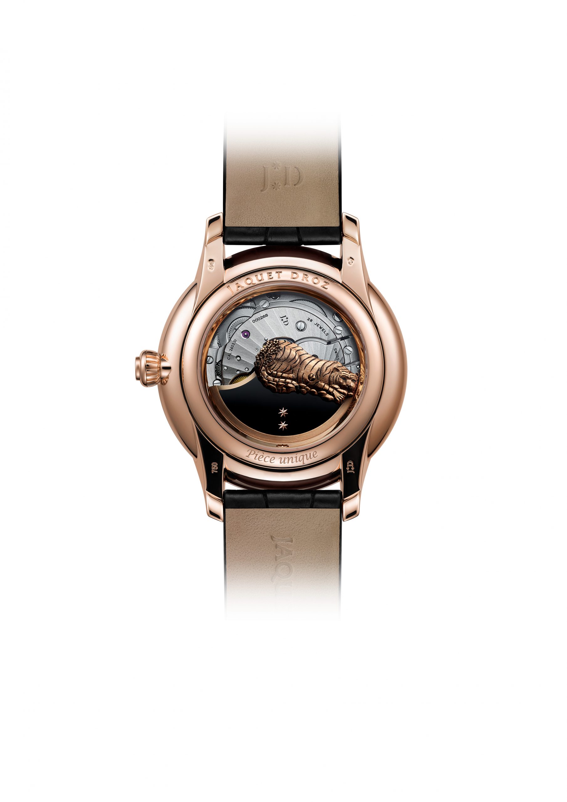 Giống như một tấm gương phản chiếu, ở phía bên kia, Chúa Sơn Lâm điêu khắc vàng đỏ – bao quanh bởi bộ vỏ cùng chất liệu – có tinh thần và phong thái thư thả và bình yên trong màn đêm. Sử phương pháp chạm khắc nổi 3D – một kỹ thuật hoàn thiện thủ công được Jaquet Droz đã luôn duy trì đã được ứng dụng để điểm tô trong việc tạo ra bức tranh sinh động, có hồn và có tình nhất.